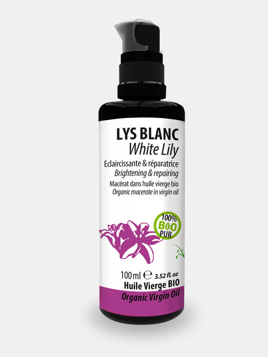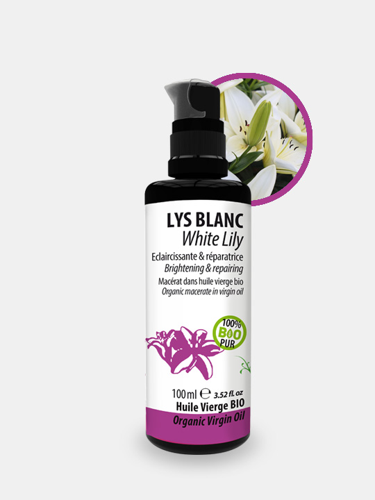 Macérat huileux obtenu par filtration après macération des fleurs de Lys blanc Bio dans de l’huile Bio de Tournesol.